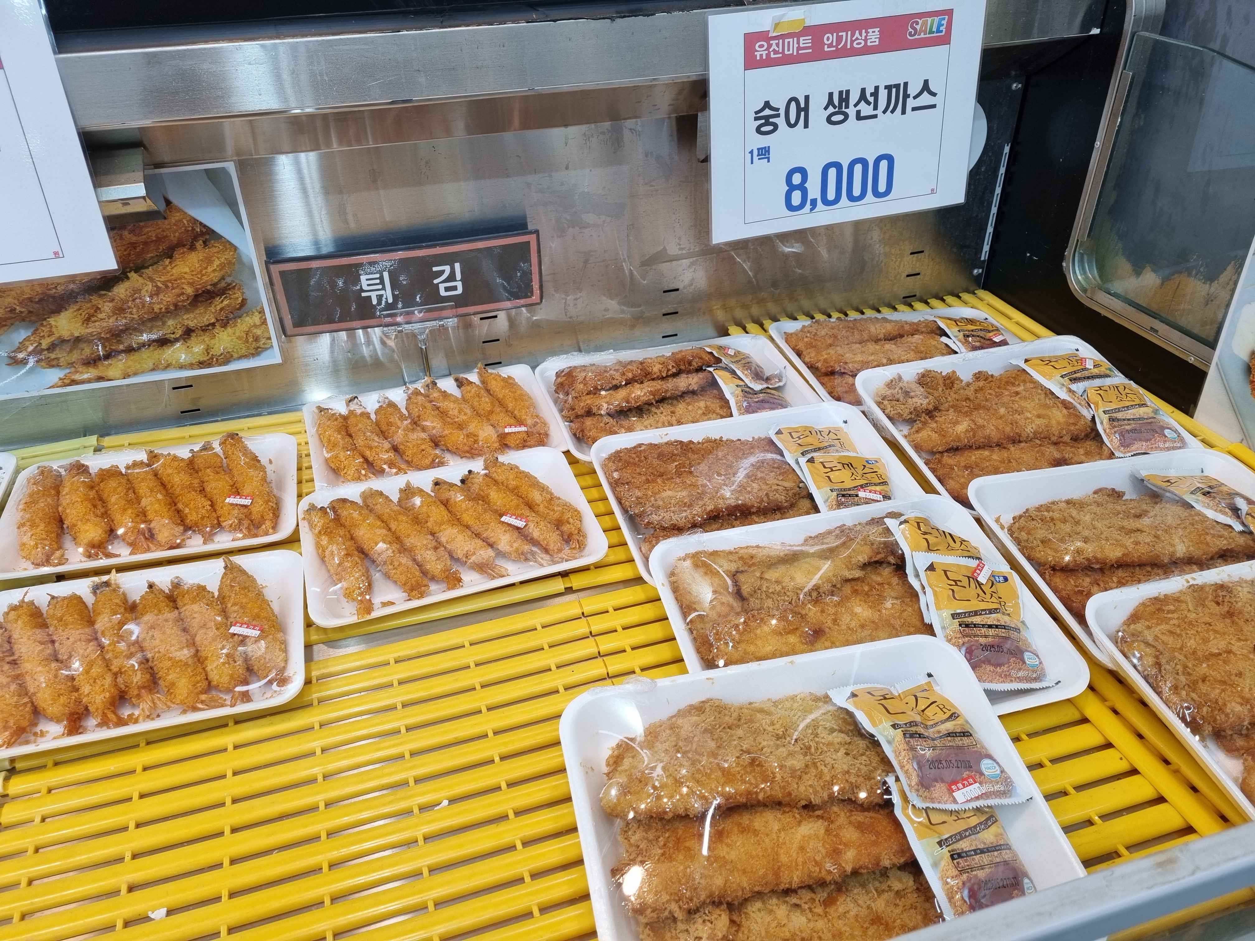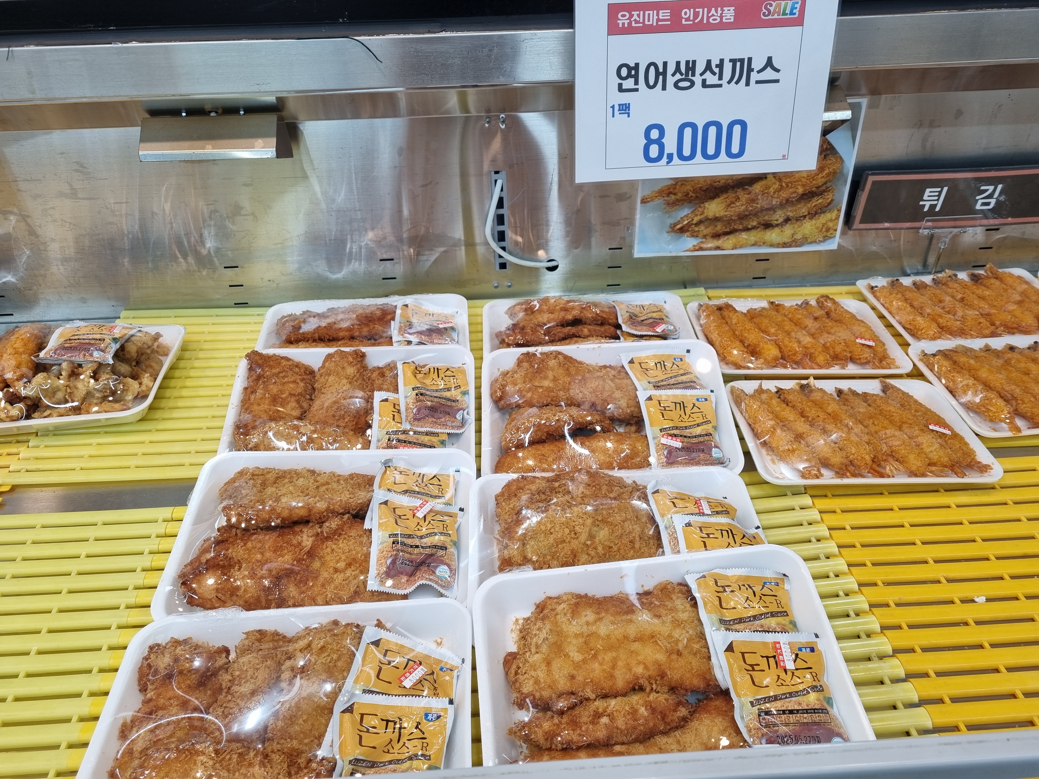 즉석에서 튀겨 바로 포장해 따끈한 생선까스와 새우 튀김도 있습니다.
